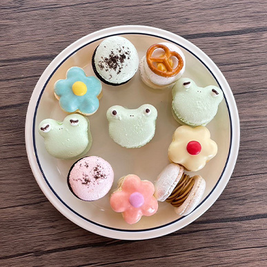 CAFE REEDの人気スイーツ「マカロン」は、こだわりのバタークリームをたっぷり挟んだぷっくりシルエット、プレゼントにもおすすめです。